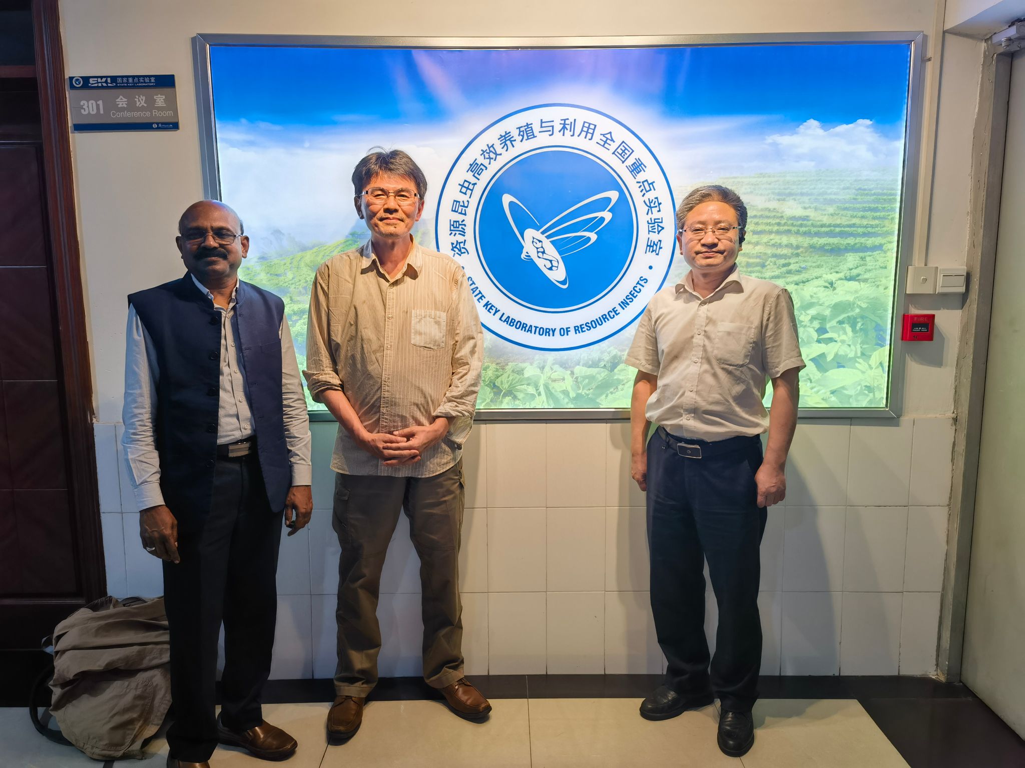 来访专家在了解了本实验室的建设发展历程和近年来取得的新成就之后,表达了对实验室的赞许和钦佩。Manthira Moorthy作为印度中央丝绸局(Central Silk Board, CSB)主席,主持科技研发、蚕种生产和供销工作,开展家蚕遗传育种相关研究;Shuichiro Tomita是日本农业生物资源研究所家蚕研究课题组带头人,开展遗传进化与功能基因组研究。两位代表均属蚕业界的国际同行,与我方交流热烈,共鸣强烈,对未来合作交流产生了浓厚兴趣。
