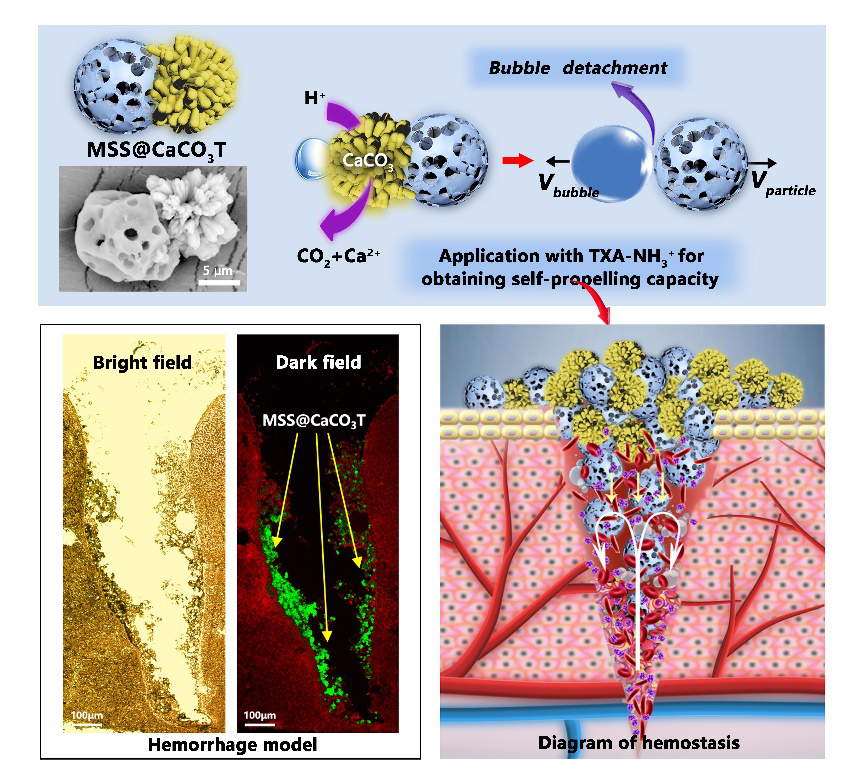 在战场创伤和意外事故中,贯穿型及窄而深的伤口出血,由于出血量大且出血点隐蔽,若不能及时有效的止血,短时间即可能导致出血过多而死亡。传统的止血材料往往只能施加于伤口的表面,难以及时深入伤口内部的出血点,因而难以快速有效控制该类型大出血。该研究通过对止血粉的表面赋能,使止血颗粒在施加于伤口时能高精度“自推进”至深型、贯穿型、无规型等类型的大出血伤口的隐蔽出血点,并发挥其负载的止血因子的作用,实现伤口靶向止血。研究成果革新了传统止血材料仅仅依靠创口表面封堵的常规方式,取而代之以能实现将止血材料快速递送到伤口内部出血点进行精准止血的止血新途径。它在战场急救和事故现场急救上具有重大的应用前景,而且为止血材料领域中设计定向功能化结构、构建载送药物驱动力模型及研发快速有效止血材料提供了新的思路。