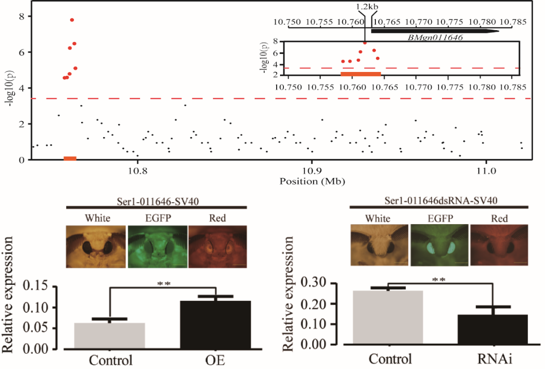 代方银课题组基于长期的家蚕种质资源和遗传学研究积淀,根据家蚕遗传特性重新建立了适合于其数量性状分子遗传定位的分析方法,分别在家蚕第1、11和22号染色体上“识别”出控制产丝量的主效位点,它们对茧丝产量性状“茧层量”的贡献率分别达到35%、15%和4.5%。在此基础上,本研究针对第11号染色体上的主效位点开展基因鉴定,通过规模化的产丝量差异品系关联分析、精细定位、基因表达和功能鉴定等综合手段,确定β-1, 4-N-乙酰氨基葡糖胺1基因(BmGlcNase1)为家蚕产丝量的关键主效基因。过表达BmGlcNase1分别使雌性和雄性个体提升10.9%和8.5%的产丝量,敲低该基因则雌雄蚕产丝量均下降约7%,体现了该基因对于蚕丝产量的突出重要性。该研究首次利用正向遗传学研究方法鉴定到控制家蚕茧丝产量性状的基因,为进一步提高家蚕产丝能力的遗传改良提供了重要靶标。