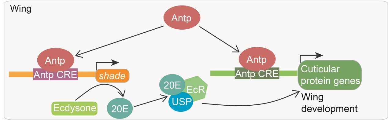 课题组研究表明,在家蚕、果蝇和赤拟谷盗中敲低或敲除Antp基因后会导致成虫翅变小,且呈卷曲皱缩状。进一步研究揭示,Antp通过直接调节翅原基中蜕皮激素合成基因Shade的表达,从而调控翅原基中蜕皮激素20-羟基蜕皮酮(20E)的含量,进而调节昆虫变态过程中翅的发育;同时,Antp也能直接通过与翅发育相关基因(如表皮蛋白基因)的顺势调控原件结合调控翅的发育。该研究不但提供了Hox基因Antp对昆虫翅发育不可或缺的新认识,而且深入解析了Antp基因调控昆虫翅发育的分子机理。