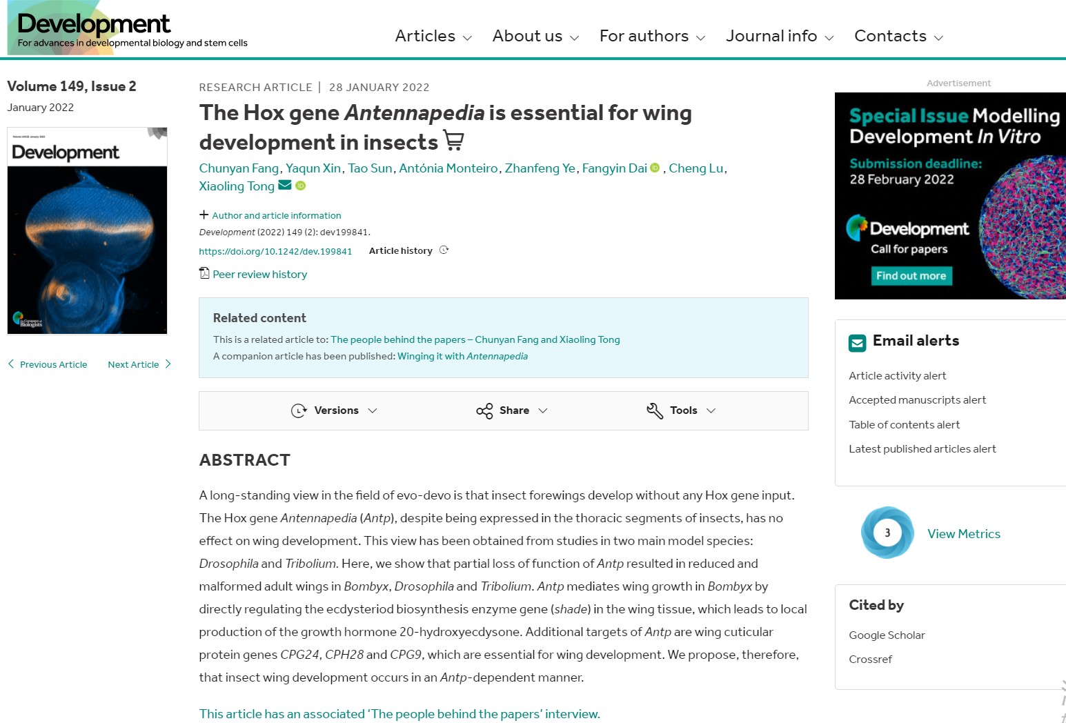全文链接://journals.biologists.com/dev/article-abstract/149/2/dev199841/274154/The-Hox-gene-Antennapedia-is-essential-for-wing?redirectedFrom=fulltext