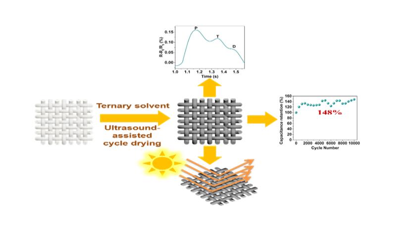 基于上述问题和分析,西南大学代方银教授团队研究人员将蚕丝织物用三元溶剂预处理,然后采用超声辅助循环干燥法直接制备了具有柔性超级电容器和传感器应用潜力的低成本、环保型、高性能还原氧化石墨烯丝织物电极(RGO-蚕丝织物)。