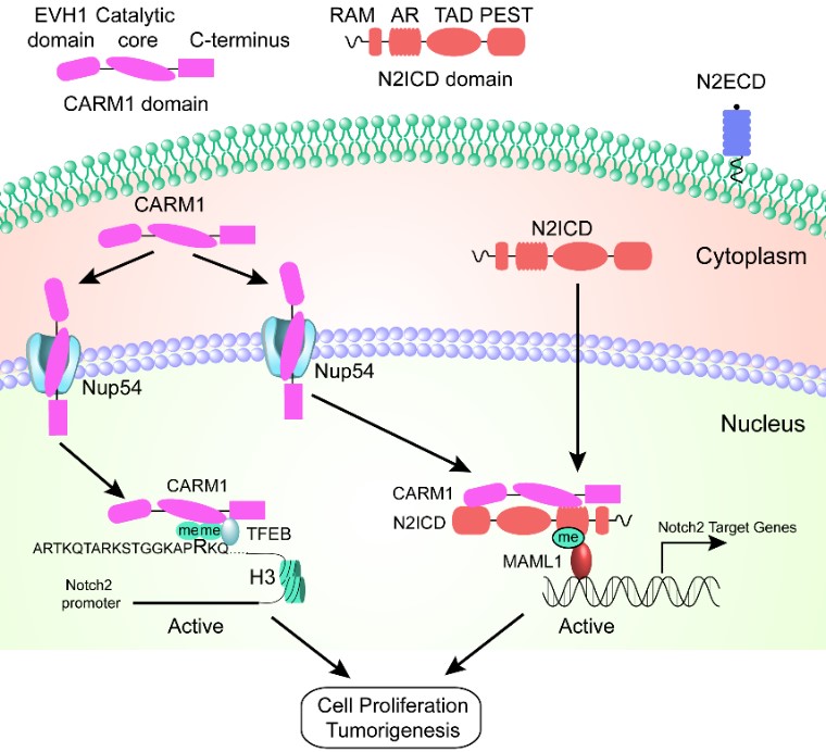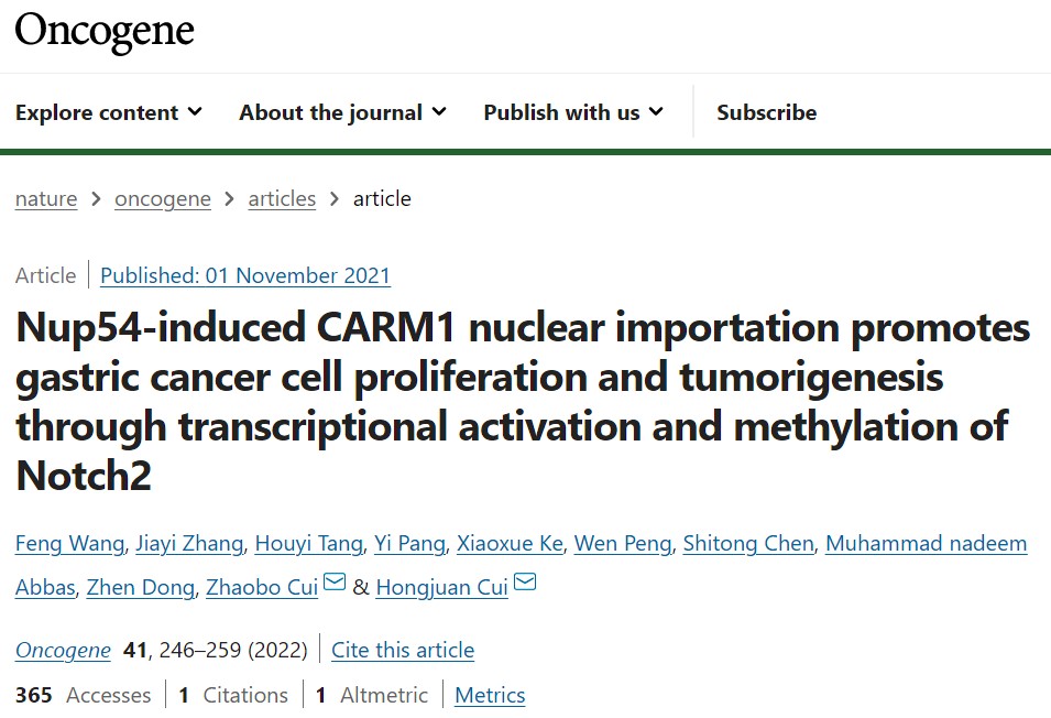 2022年1月,Oncogene杂志发表了来自西南大学家蚕基因组生物学国家重点实验室崔红娟教授组题为“Nup54-induced CARM1 nuclear importation promotes gastric cancer cell proliferation and tumorigenesis through transcriptional activation and methylation of Notch2”的研究文章。该文章揭示了精氨酸甲基转移酶CARM1通过转录激活和蛋白翻译后修饰调控胃癌细胞增殖和肿瘤发生的机制。
