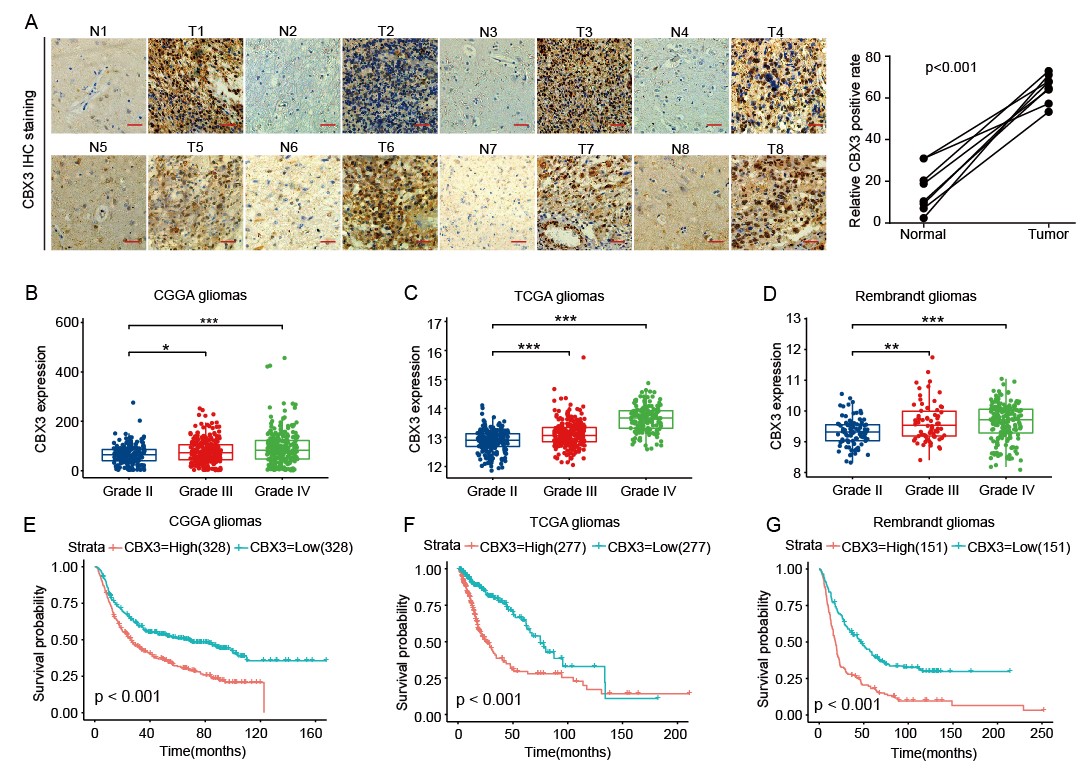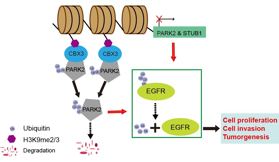 崔红娟教授团队就GBM标志物的筛查、鉴定以及如何管控EGFRGBM的表达开展了深入研究。首先, GBM患者组织的免疫组化病理检测以及生物信息学分析发现一种能够参与异染色质形成的H3组蛋白甲基化阅读器CBX3Chromobox 3)在GBM患者中异常高表达,并且与GBM的预后和恶性分级密切相关。功能检测表明了CBX3 在体外和体内显著促进 GBM 细胞的增殖、侵袭和肿瘤发生。从机制上来说,我们通过Ch-IPCo-IP等一系列生物技术实验证明了CBX3促进GBM 的恶性进展是EGFR 依赖性的,并且进一步揭示了GBM患者发病机理的一条全新的信号通路CBX3-PARK2/STUB1-EGFR。该研究不仅丰富了GBM表观遗传学的研究,也为该信号通路作为GBM潜在治疗靶点的可行性提供了坚实的依据。西南大学2020级博士研究生彭文为第一作者,崔红娟教授为该论文的通讯作者。该研究得到了重庆市自然科学基金和重庆市博士生科研创新项目的支持。