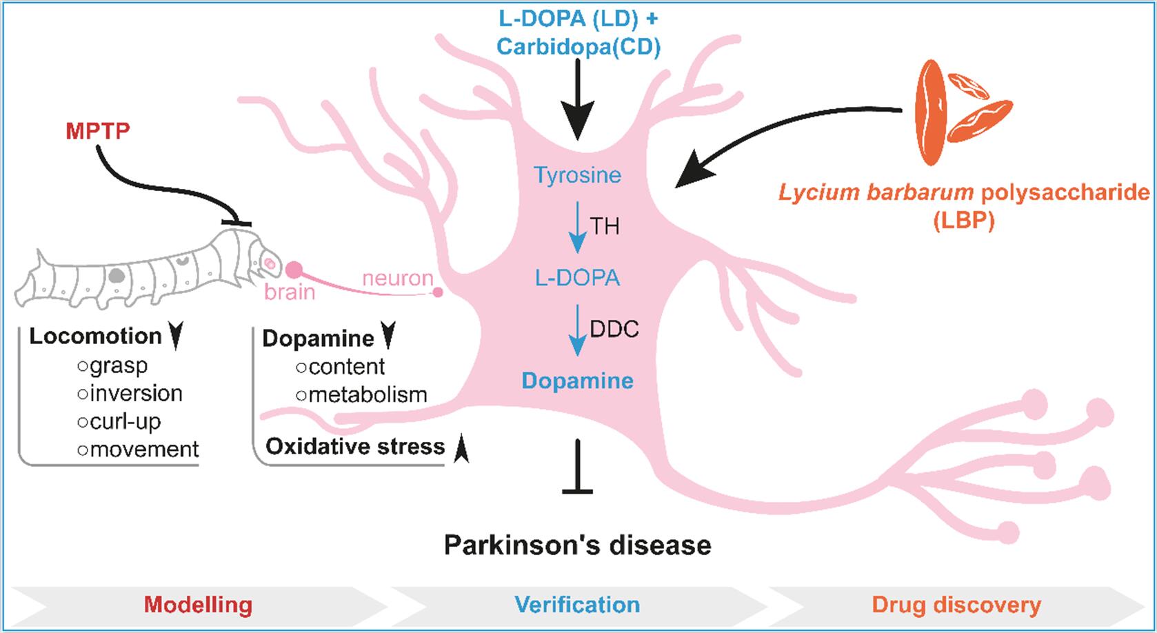 2022年10月28日,中科院分区医学大类一区期刊BMC Medicine在线发表了家蚕国重室代方银教授团队研究论文“Lycium barbarum polysaccharide improves dopamine metabolism and symptoms in an MPTP-induced model of Parkinson’s disease”。该研究以家蚕为实验动物建立了帕金森综合征(PD)病理模型,用临床治疗人类PD的药物左旋多巴对该病理模型进行了系统性评价,并经筛选发现了一种对PD具有良好效用的中药活性成分枸杞多糖(LBP)。