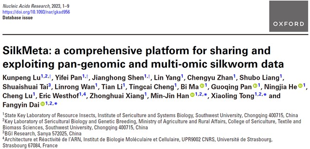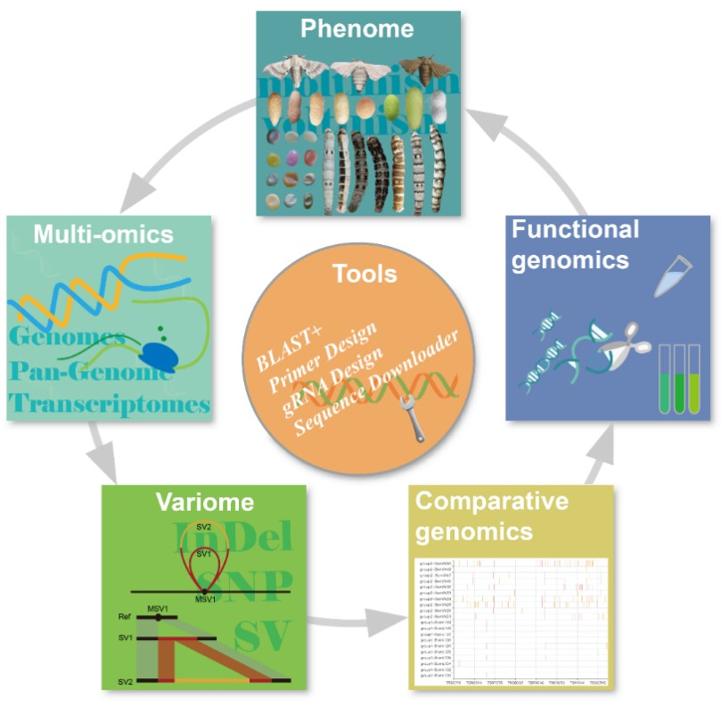 代方银教授团队的最新科研成果——家蚕泛基因组和多组学数据分析平台(SilkMeta)。这是继2022年研究团队发表家蚕泛基因组论文(Nat. Commun., 2022)之后,在家蚕种质资源基因组和生物信息分析领域取得的又一突出进展,标志着团队创建“数字家蚕”的工作迈入新阶段,对于推动家蚕泛基因组成果在功能基因组、基因组选择和分子设计育种等方面的研究应用具有重要意义。
