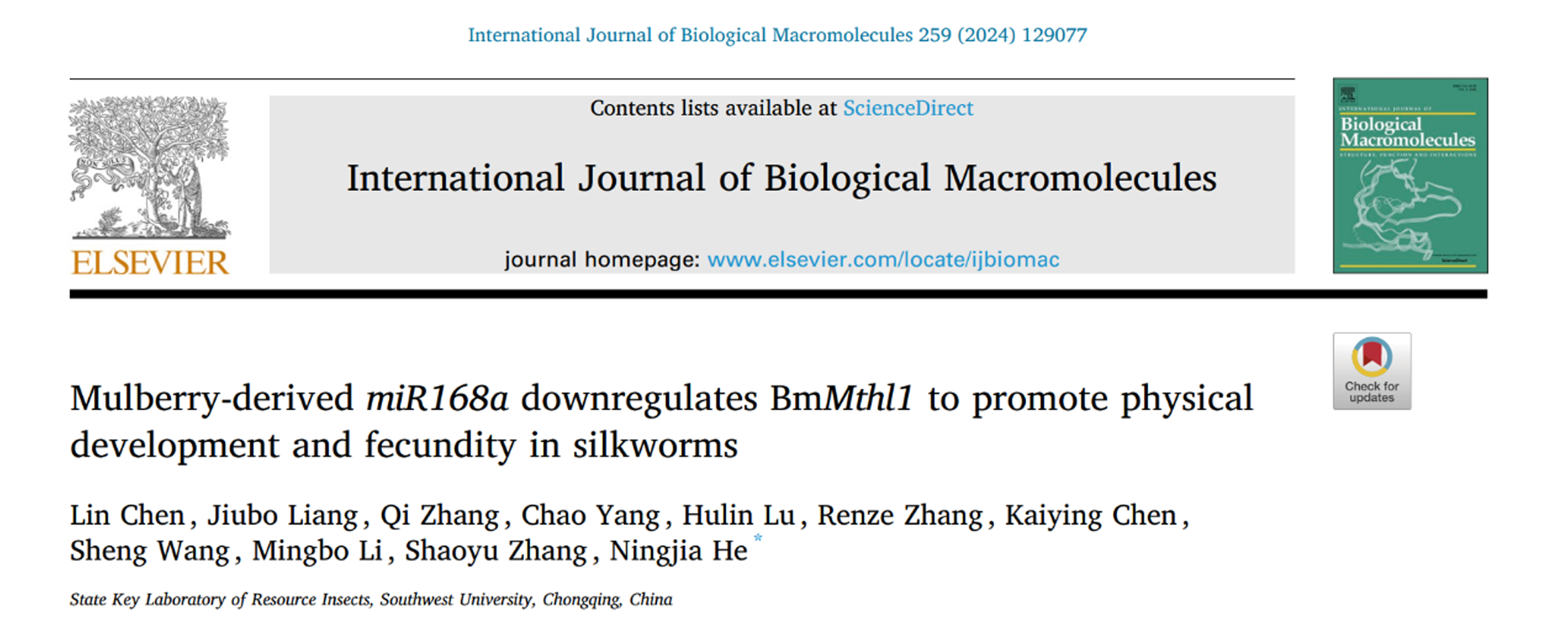 何宁佳教授团队在International Journal of Biological Macromolecules(中科院1区TOP,IF=8.2)上发表题为“Mulberry-derived miR168a downregulates BmMthl1 to promote physical development and fecundity in silkworms”的研究论文。