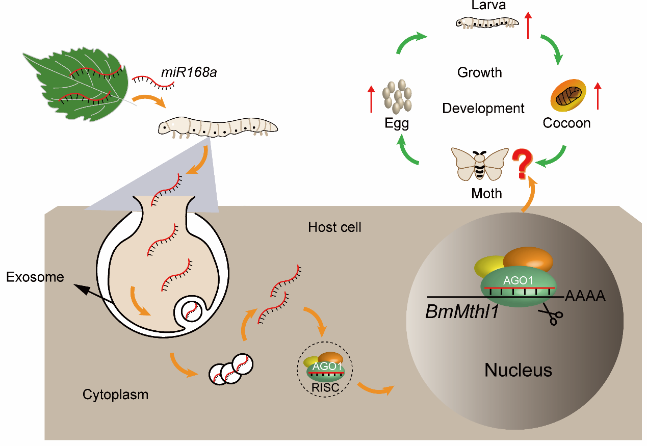图1 桑树源miR168a通过外泌体运输进入家蚕体内抑制BmMthl1表达的示意图