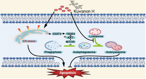 在该研究中,研究人员首先证实桑皮酮H在体外能显著抑制黑色素瘤细胞增殖。随后通过组学分析和细胞实验,发现桑皮酮H可引起内质网应激和细胞自噬。桑皮酮H阻断了自噬小体和溶酶体的融合,破坏了的自噬降解过程。研究证实,桑皮酮H介导的内质网应激可通过ATF4-DDIT3-TRIB3-AKT-MTOR信号轴促进自噬小体的形成。此外,研究人员发现桑皮酮H可能通过阻断癌细胞对的顺铂引起的活性氧和损伤线粒体的自噬清除,从而增强了顺铂对黑色素瘤细胞的化疗效果。