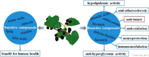 作为桑树栽培大国,我国对桑树医药应用有着悠久的历史。桑叶、桑枝、桑葚和桑根皮等桑树的多个部位由于其具有抗炎、抗病毒、降血糖、抗肿瘤等功效,被用作传统中药材。这些桑树中药材中含有含有大量的生物活性成分,具有重要的药理作用。