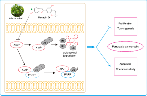 在该研究中,研究人员首先通过网络药理学数据库分析发现桑树中的苯并呋喃类化合物桑辛素D是一种潜在的抗癌活性物质并与癌症通路密切相关。随后通过组学分析、细胞生物学和分子生物学等实验,揭示桑辛素D显著抑制胰腺癌细胞的生长并促进胰腺癌细胞凋亡。进一步研究显示,桑辛素D通过增加胰腺癌细胞中凋亡抑制蛋白XIAP的泛素化降解来下调XIAP的蛋白表达,从而减弱其下游的多聚ADP核糖聚合酶PARP1的蛋白稳定性,表明桑辛素D可以通过靶向XIAP/PARP1轴来抑制胰腺癌细胞的发展进程。此外,通过联合用药分析表明,桑辛素D与胰腺癌的临床一线化疗药物吉西他滨联合后显著增强了胰腺癌细胞的化疗敏感性,揭示了其潜在的临床应用前景。