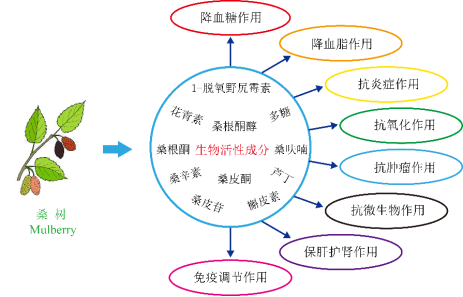 桑树不仅是养蚕业的饲料来源,也是一种重要的药用植物。桑树的多个部位均可加工为中药制剂来预防或治疗多种疾病。现代药理学研究表明,桑树的枝(桑枝)、叶(桑叶)、根皮(桑白皮)、果穗(桑葚)中富含生物碱类、黄酮类、苯并呋喃类、多糖类等化学成分,这些物质具有降血糖、降血脂、抗炎、抗肿瘤、肝脏保护以及免疫调节等多种药理活性。