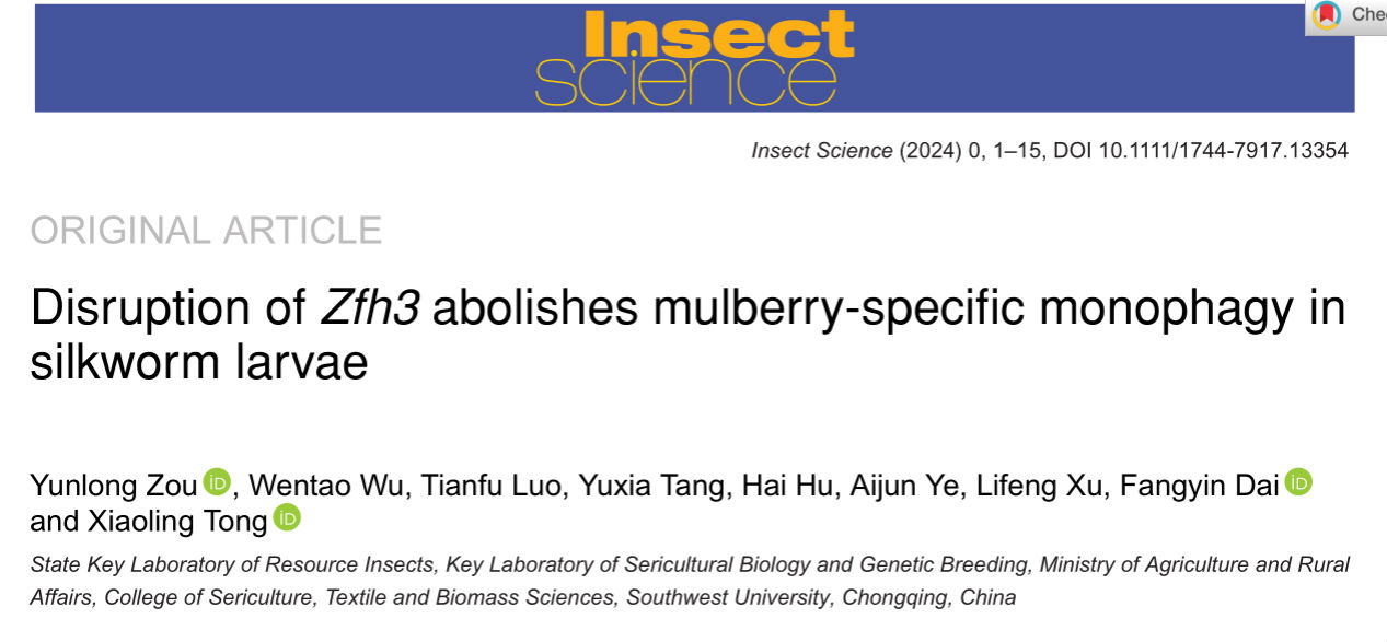 童晓玲教授课题组在昆虫科学国际期刊Insect Science(中科院SCI分区1区)在线发表了题为“Disruption of Zfh3 abolishes mulberry-specific monophagy in silkworm larvae”的研究论文,该研究揭示转录因子Zfh3调控家蚕对桑叶的偏好性。