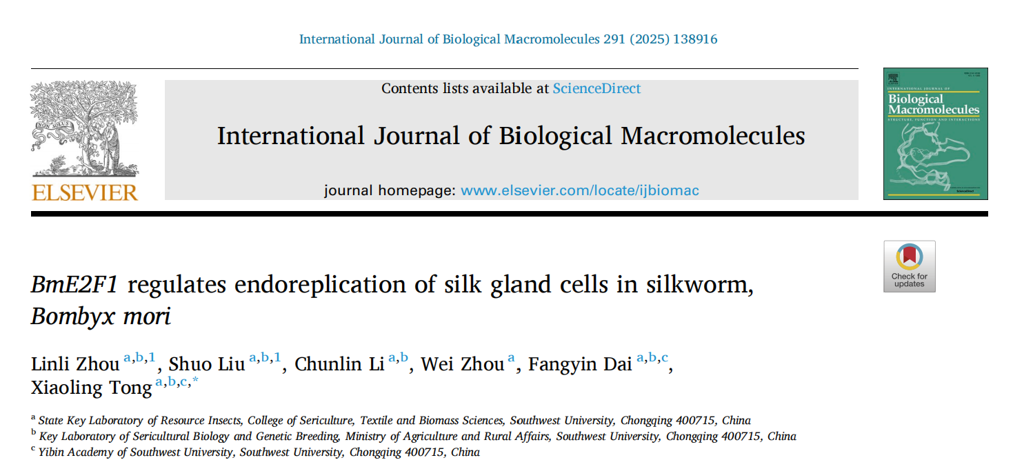 童晓玲教授课题组前期研究发现BmE2F1能显著提升家蚕的茧丝产量(Nat. Commun,2022),但是其具体的分子机制尚不清楚。2024年12月26日,该课题组在国际学术期刊International Journal of Biological Macromolecules(中科院一区)在线发表了题为“BmE2F1 regulates endoreplication of silk gland cells in silkworm, Bombyx mori”的研究论文,该研究揭示转录因子BmE2F1通过调控丝腺细胞核内复制进而影响家蚕茧丝产量。
