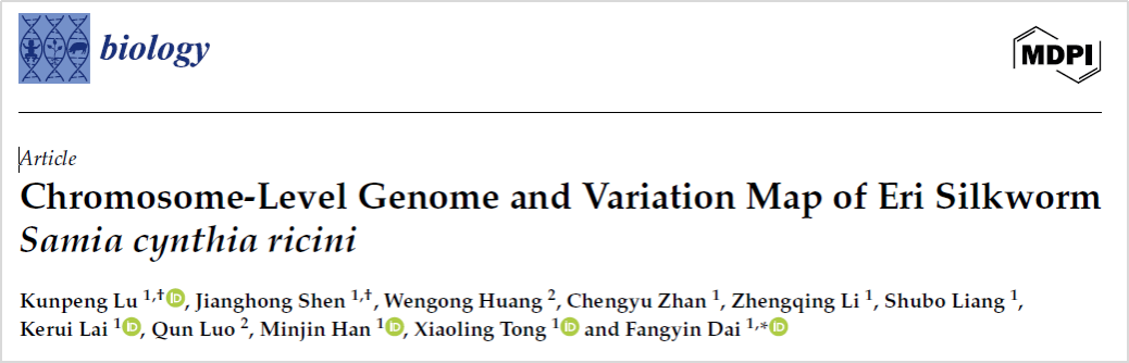 代方银教授团队陆昆鹏博士在生物学期刊Biology发表了题为“Chromosome-Level Genome and Variation Map of Eri Silkworm Samia cynthia ricini”的研究论文,报道了蓖麻蚕的染色体级别基因组和遗传变异图谱,并在Silkmeta数据库(Nucleic Acids Research, 2024)上线了该基因组和遗传变异的访问通道,为蓖麻蚕的功能基因组学及遗传改良等研究提供了新的基因组数据和生物信息分析工具。