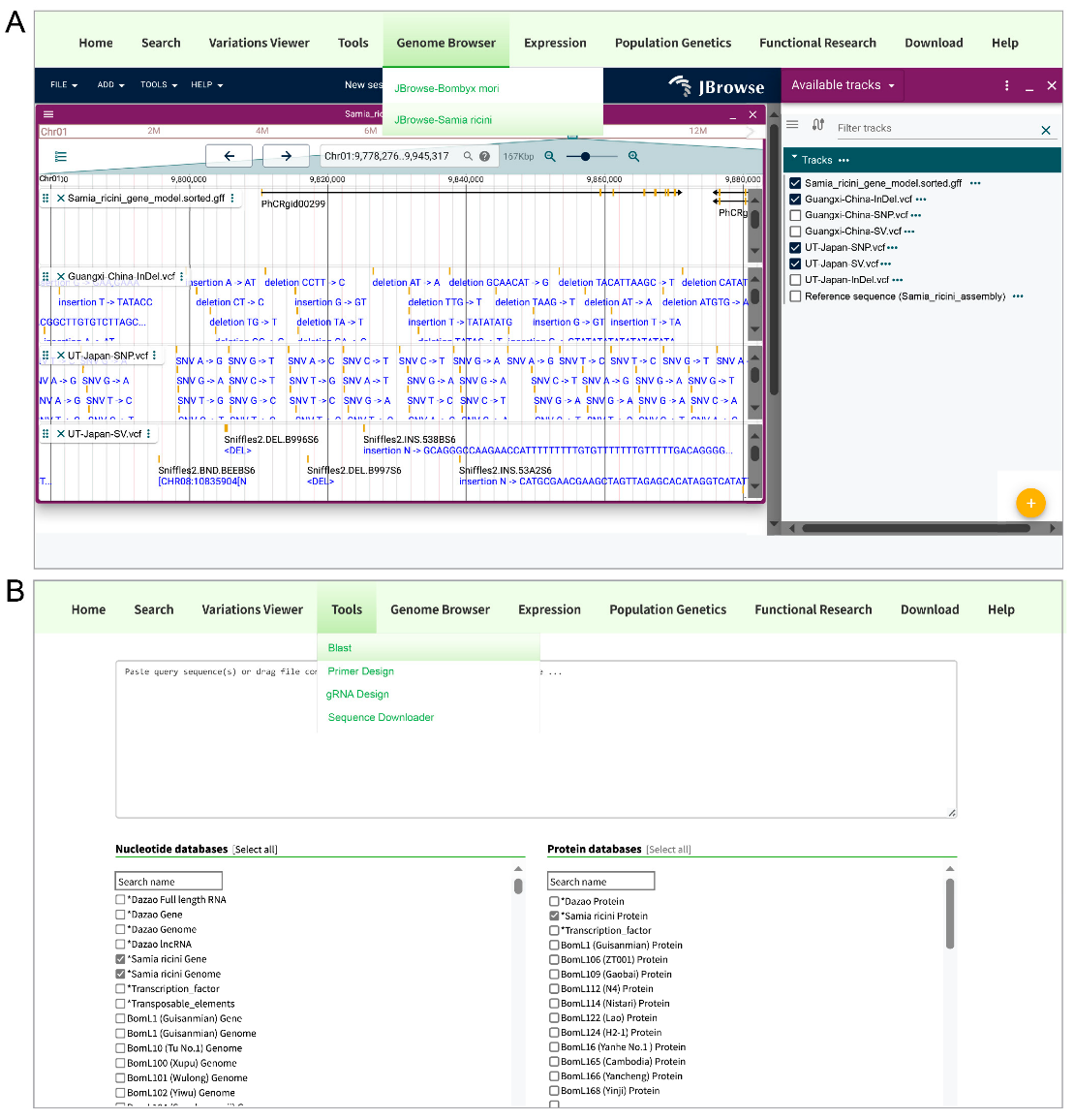 A. 基因组浏览器(Genome browser)界面;B. Blast工具界面。