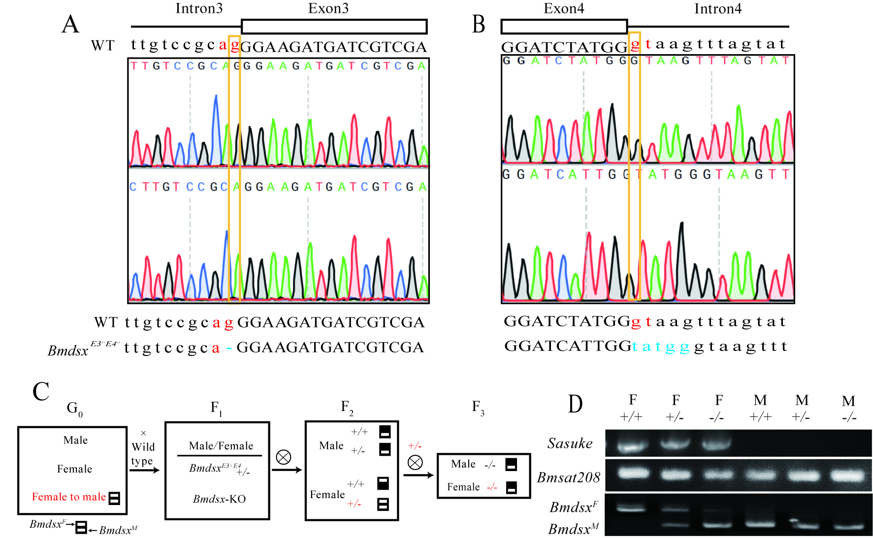 利用该系统成功构建家蚕Bmdsx雌特异性外显子剪接位点缺失的纯合系(BmdsxE3-/-E4-/-),基因编辑后的雌性家蚕(染色体倍型为ZW)成功跳过E3和E4外显子,表达雄性特异性剪接变体BmdsxM(图2)。