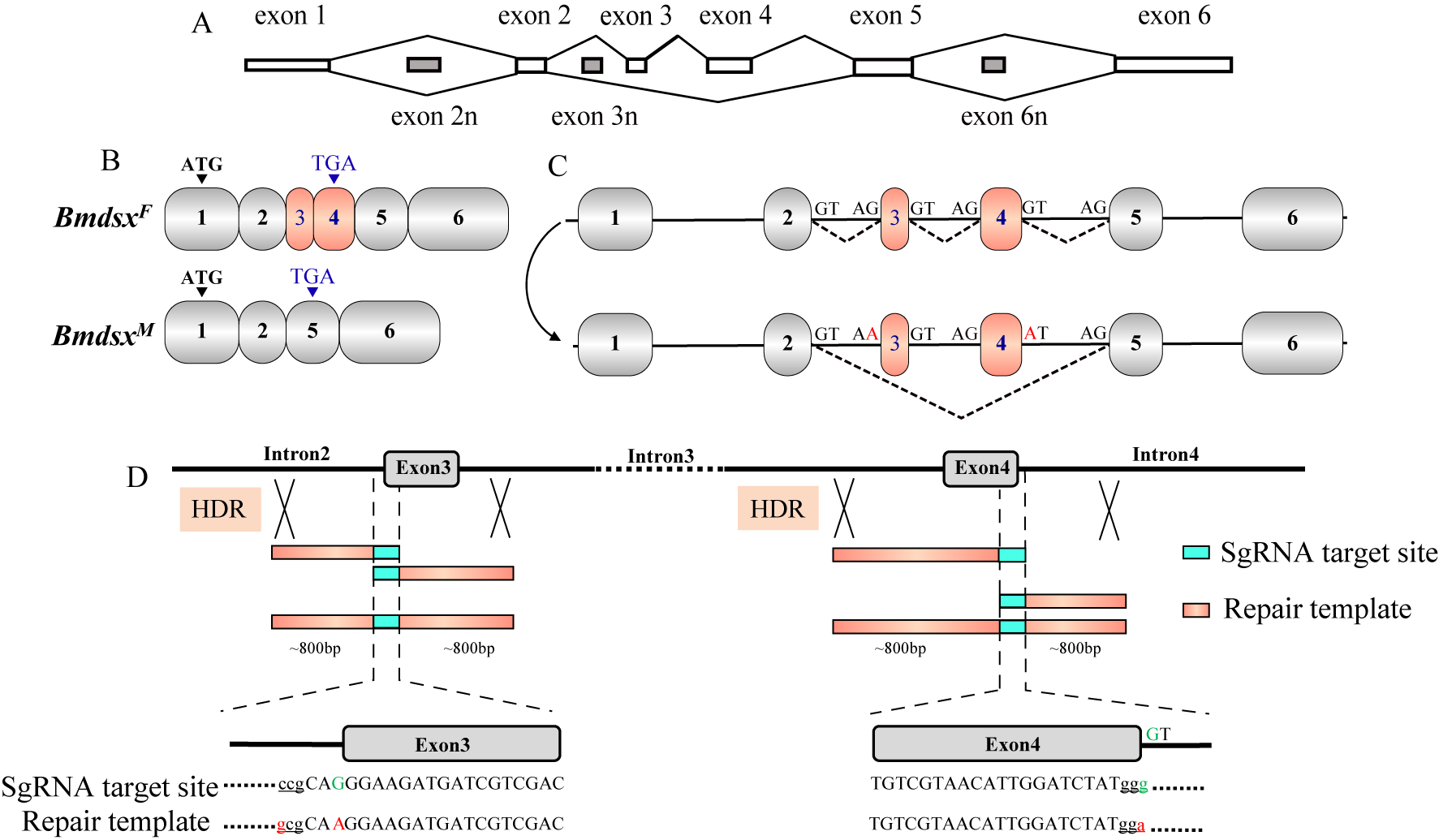 本研究创新性采用CRISPR/Cas9介导的同源修复技术,精准靶向Bmdsx基因的雌性特异性外显子剪接位点(E3的5’端与E4的3’端),通过诱导单碱基突变(G→A)破坏剪接供体/受体位点,强制雌性个体跳过E3和E4外显子,使雌性转录本(BmdsxF)向雄性转录本(BmdsxM)转变(图1)。
