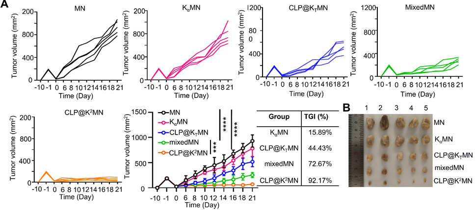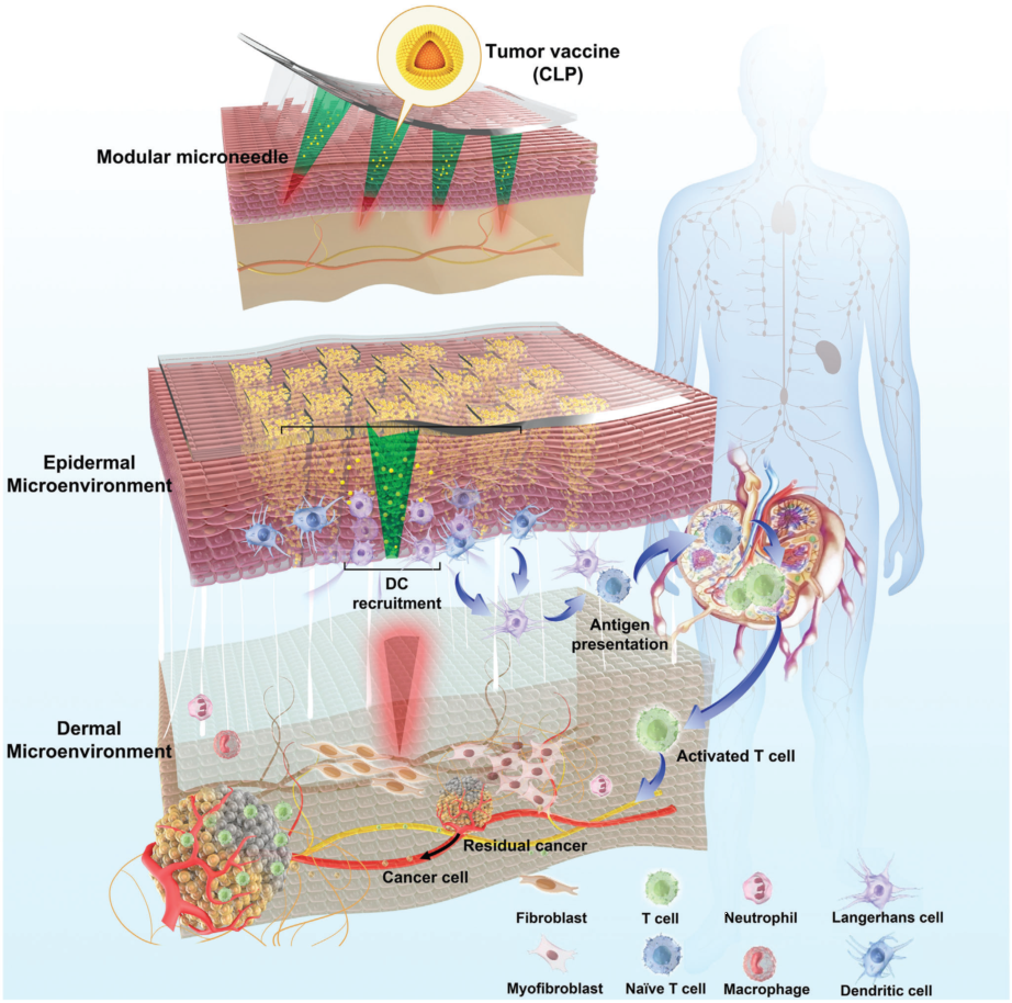 重组角蛋白RK作为微针的核心材料,凭借其出色的生物相容性和独特的生物功能特性,突破了传统微针的局限性。模块化微针的层设计:针尖层(RK81-1Aα)深入真皮,能够显著减少炎症伤口愈合时间,降低癌细胞复活的机会;针根层(SRK84-T)携带肿瘤疫苗CLP停留在表皮微环境精准吸引树突状细胞(DC)聚集,从而提高抗原呈递,激活免疫系统实现全身范围的免疫应答。