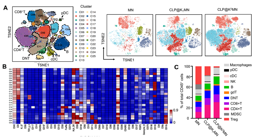 A) CLP@K2MN和其他组治疗后的肿瘤组织免疫细胞的viSNEB) 不同亚群细胞表面功能分子表达的热图C) 免疫细胞亚型的相对丰度