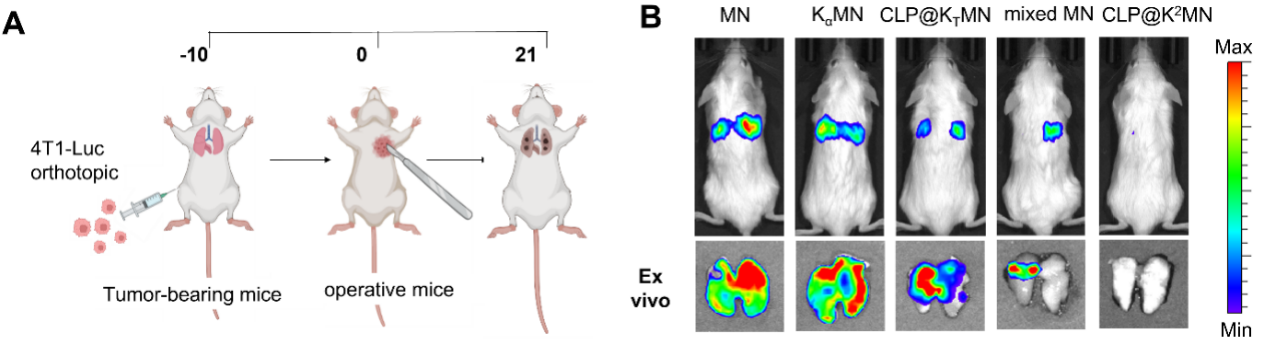 经模块化微针治疗,在三阴性乳腺癌小鼠模型中,肿瘤抑制率达92.17%,远超对照组的72.67%。在基于人源化小鼠(Hu-NSG)的患者衍生异种移植(PDX)三阴性乳腺癌模型中,观察到了相似的结果。与此同时,肺转移生物发光信号强度降至1%,肺结节几乎消失此外,免疫记忆效果显著,治愈的小鼠在长期跟踪观察中未出现复发。