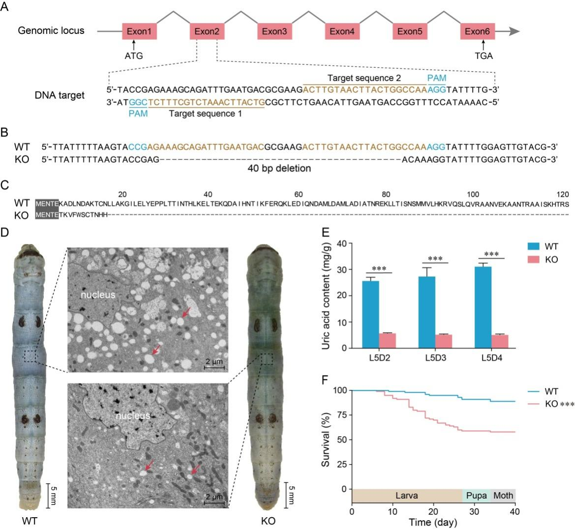 利用CRISPR/Cas9系统,成功构建家蚕BmBLOC1S6敲除纯合系(图2A-C),其幼虫出现了与霜降油蚕类似的表型特征:表皮尿酸含量降低、存活率降低、真皮细胞内尿酸颗粒形成缺陷等(图2D-F和图3A-C)。