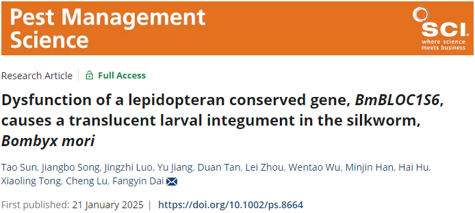 代方银教授团队题为“Dysfunction of a lepidopteran conserved gene, BmBLOC1S6, causes a translucent larval integument in the silkworm, Bombyx mori”(鳞翅目保守基因BmBLOC1S6的功能障碍导致家蚕幼虫表皮呈半透明)的研究论文。该项研究揭示了家蚕霜降油蚕(hoarfrost translucent, oh)突变体的负责基因为BmBLOC1S6,并阐明其在家蚕(鳞翅目昆虫)表皮尿酸颗粒形成中的关键作用。研究结果不仅在家蚕突变体解析方面具有重要指导意义,也对鳞翅目害虫的生态防控具有一定参考价值。