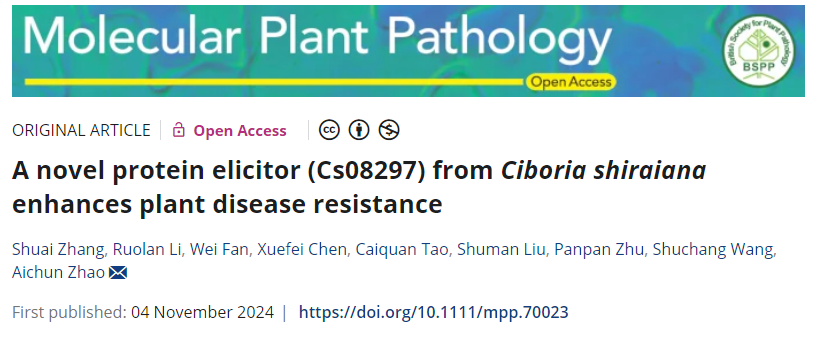 赵爱春教授课题组在中科院一区TOP期刊《Molecular Plant Pathology》在线发表了题为“A novel protein elicitor (Cs08297) from Ciboria shiraiana enhances plant disease resistance”的研究论文,该研究解析了一个新型蛋白激发子Cs08297激活植物免疫的分子机制。