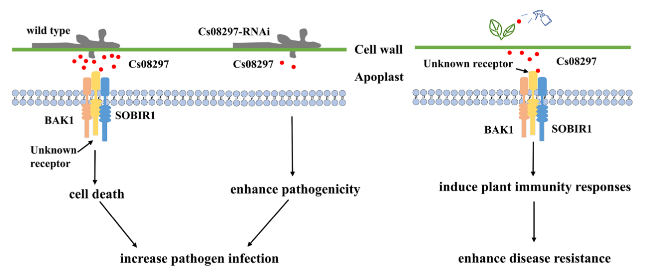 图1. 效应蛋白Cs08297调控植物免疫的机制及其应用于绿色防治的工作模型
