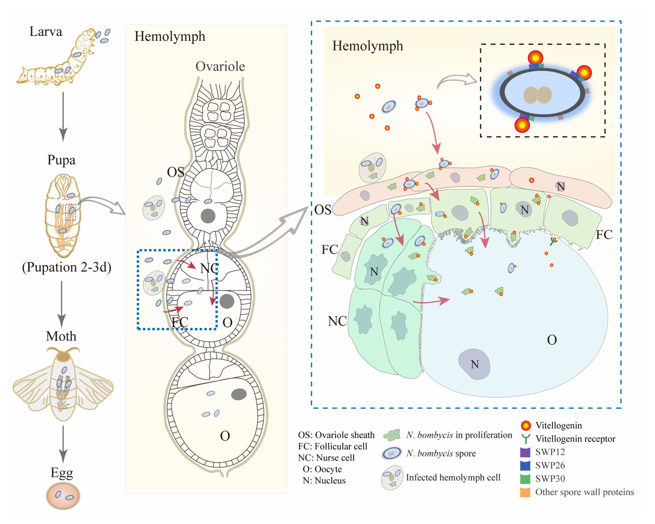 研究发现,在蛹期3天卵巢管突破卵巢膜游离于血淋巴中时,家蚕微孢子虫开始侵染卵巢管。此时,血淋巴中的病原与卵管表面黏附,从而侵入卵管鞘细胞并在其中增殖,继而侵入紧邻的滤泡细胞。自此,病原可通过以下两条路径侵入卵母细胞:(1)在滤泡细胞中增殖后,直接侵入卵母细胞;(2)从滤泡细胞先侵入滋养细胞,增殖后再侵入卵母细胞。对感染的滤泡细胞和滋养细胞进行超微观察,发现细胞结构发生重要变化:两种细胞与卵母细胞间的间隙变窄或消失,并且两种细胞中均发现包含有病原体的大囊泡结构突入卵母细胞中。进一步分析发现,病原侵染卵巢管的时间与家蚕卵黄原蛋白(BmVg)的高量表达同步,而且病原在侵染过程中其表面均结合有家蚕卵黄原蛋白;后续实验证实家蚕卵黄原蛋白可与病原表面的多种蛋白(SWP)结合;敲降家蚕卵黄原蛋白表达,以及利用抗体封闭家蚕卵黄原蛋白与病原表面蛋白的结合,发现卵巢管和子代卵粒的感染量均显著降低,表明家蚕卵黄原蛋白与病原表面蛋白的结合是介导该病原垂直传播的关键。进一步分析表明,家蚕卵黄原蛋白的VWD和DUF结构域是介导其与病原表面蛋白结合的关键区域。