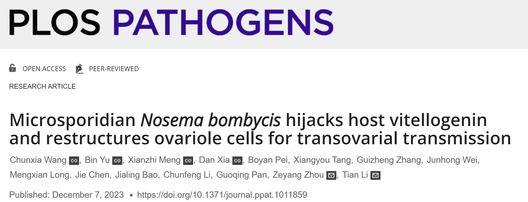 近日,实验室李田研究员课题组在微生物学Top期刊PLoS Pathogens在线发表了题为“Microsporidian Nosema bombycis hijacks host vitellogenin and restructures ovariole cells for transovarial transmission”的研究论文,揭示了家蚕微孢子虫侵入家蚕卵母细胞的时间、路径、形态、策略和关键分子机制。