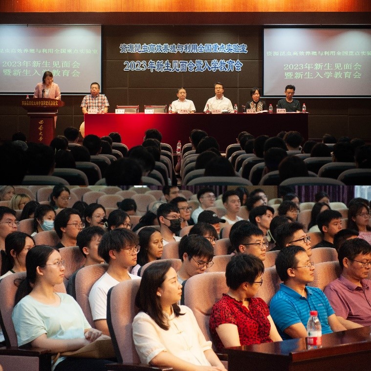 2023级新生见面会暨入学教育会在蚕学宫报告厅举行。蚕桑纺织与生物质科学学院党委张袁松书记、国重实验室主任、蚕桑纺织与生物质科学学院院长代方银教授、实验室副主任何宁佳教授、崔红娟教授、潘国庆教授、袁联伟老师、实验室部分教师以及2023级全体研究生共同出席了会议。新生见面会由副主任崔红娟教授主持,入学教育会由蔡晓霞老师主持。