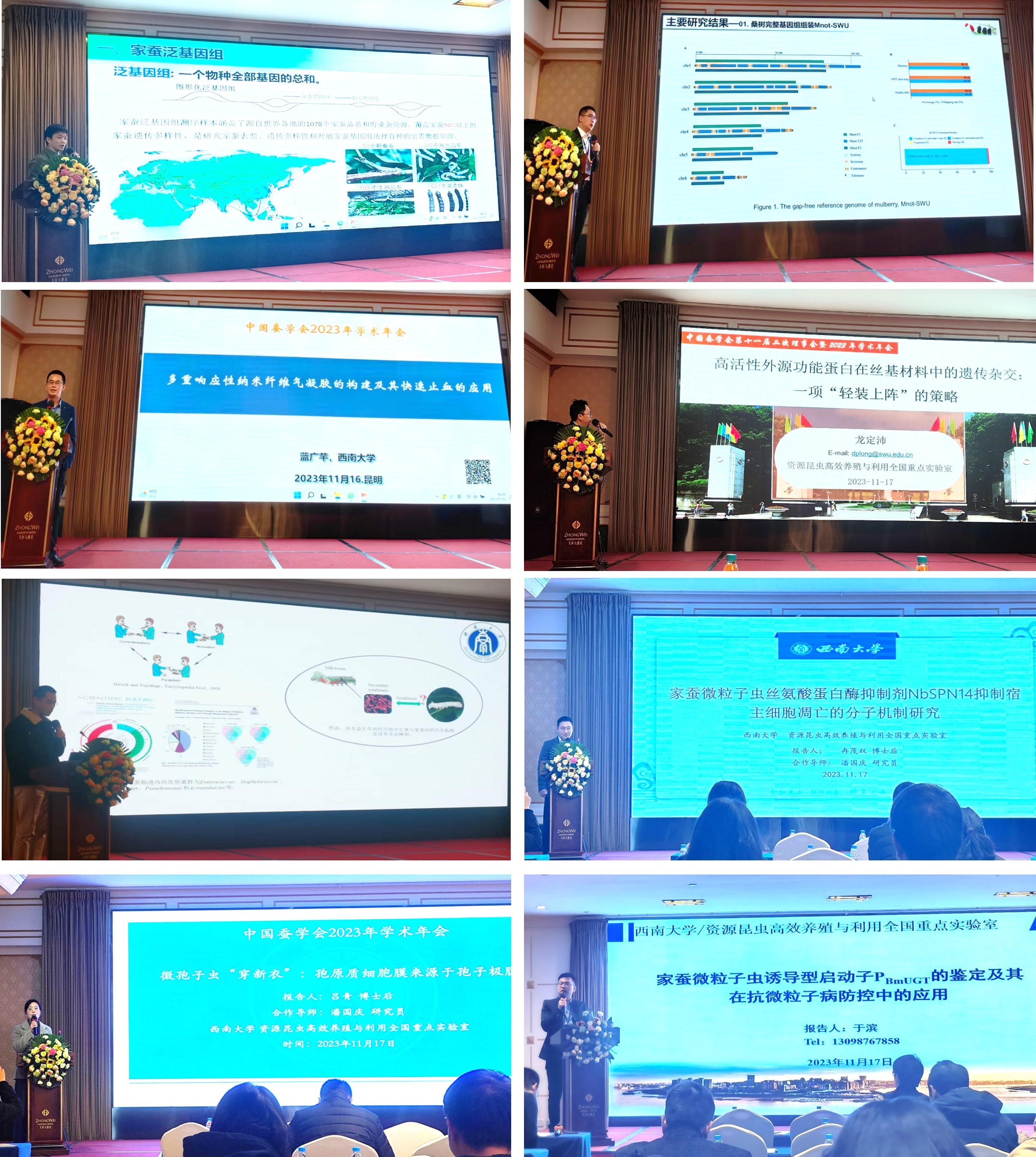 西南大学资源昆虫全国重点实验室及蚕桑纺织学院共有18名研究人员参加本次学术年会,包括胡永刚研究员在内,共作学术报告9个。在大会报告上,先后有陆昆鹏博士后作了题为“家蚕泛基因组和多组学数据库(SilkMeta)的构建和应用”的报告,马赑副教授作了题为“桑树完整基因组图谱构建揭示染色体结构与进化”的报告,蓝广芊教授作了题为“多重响应性蚕丝纳米纤维气凝胶的构建及其快速止血的应用”的报告;在分会场交流报告上,龙定沛副教授作了题为“高活性外源功能蛋白在丝基材料中的遗传杂交:一项‘轻装上阵’的策略”的报告,冉茂双博士后作了题为“家蚕微粒子虫丝氨酸蛋白酶抑制剂 NbSPN14 抑制宿主细胞凋亡的分子机制”的报告,李冠楠老师作了题为“共生 Bacillus subtilis对家蚕的益生机制”的报告,吕青博士后作了“‘穿新衣’-家蚕微粒子虫极膜层经极管运输后转变为孢原质膜”的报告,于滨博士后作了题为“家蚕微粒子虫诱导型启动子PBmUGT的鉴定及其在抗微粒子病中的应用”的报告。以上报告展示了本单位最新研究成果和进展动态,引起与会人员的广泛关注和讨论。