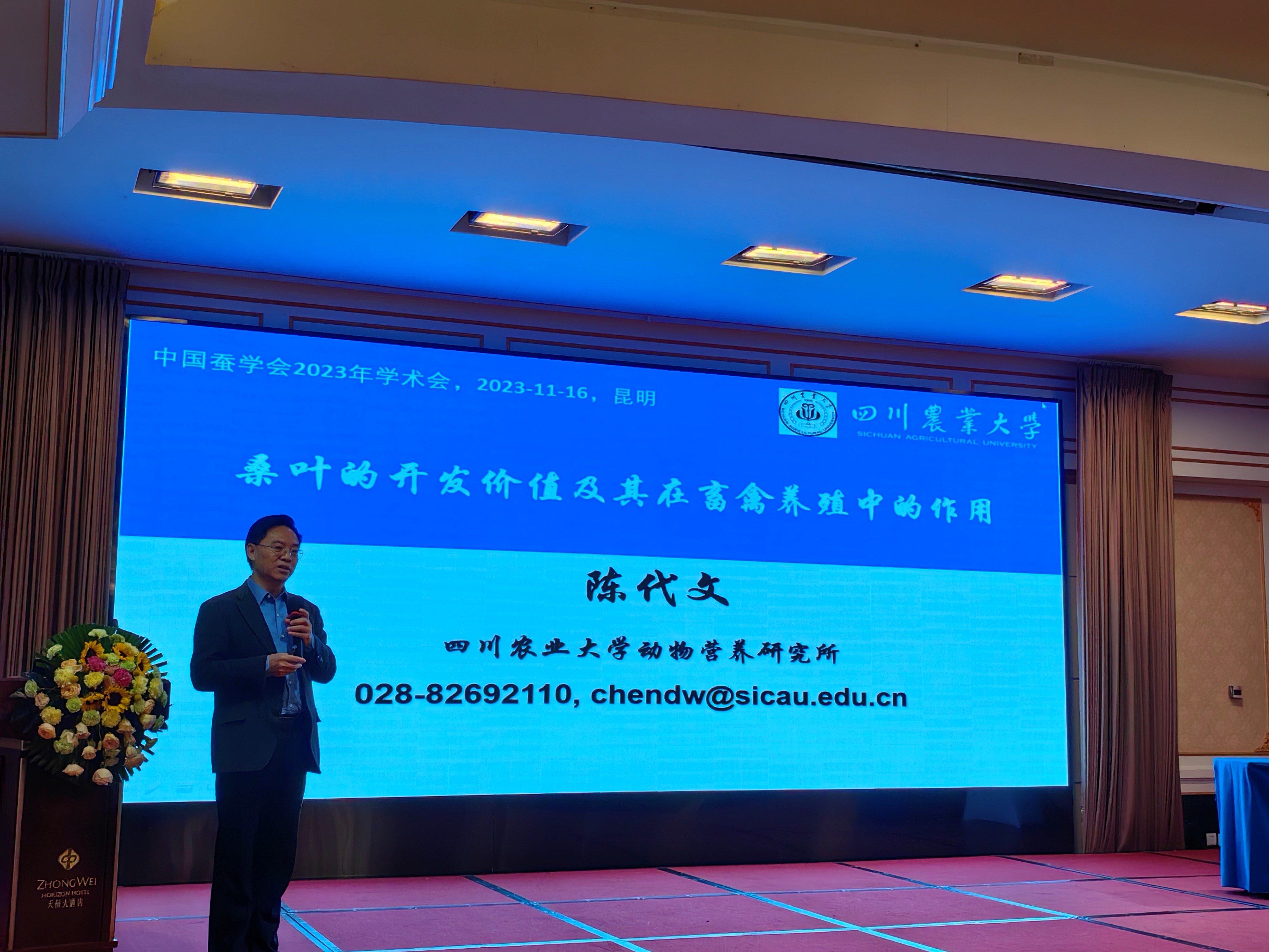 本次会议邀请四川农业大学陈代文教授和西南大学胡永刚研究员作特邀报告。陈代文教授以“桑叶的开发价值及其在畜禽养殖中的作用”为题,阐述了在饲料资源面临挑战的背景下,发现桑叶具有功能物质丰富、营养价值高、替抗作用突出等显著特点,完全可作为优质功能饲料开发应用。陈教授近期对桑叶饲料价值进行了科学系统的评价,以猪为试验对象取得了很好的结果。陈代文教授是动物营养与饲料科学领域的知名学者,2023年获全国创新争先奖章,他的报告为桑叶饲料开发与推广提供了重要理论依据、确凿的数据支撑,现场引起热烈反响。