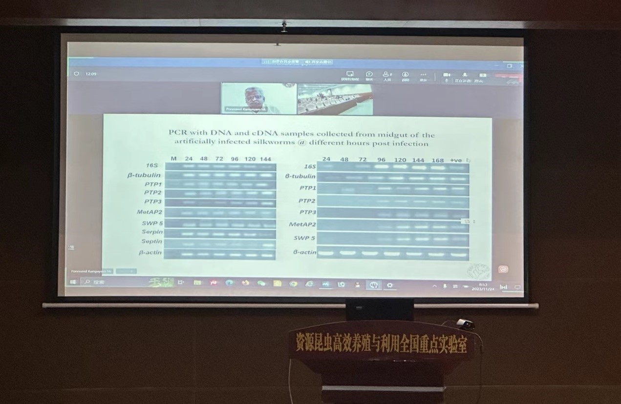 以及研究团队在家蚕和野蚕(柞蚕等)蚕病领域的研究成果,重点探讨了蚕病毒病和微粒子虫病的检测新方法建立及应用情况。此外,他还探讨这些研究对于印度蚕桑产业的潜在影响。在场师生们积极提问并与Dr. Kangayam Ponnuvel开展互动交流,气氛热烈。此次报告为相关领域的研究生提供了非常好的学习和交流机会。Dr. Kangayam Ponnuvel表示,期待与资源昆虫全国重点实验室进一步加深合作,共同解决蚕病检测和防治的重大问题。