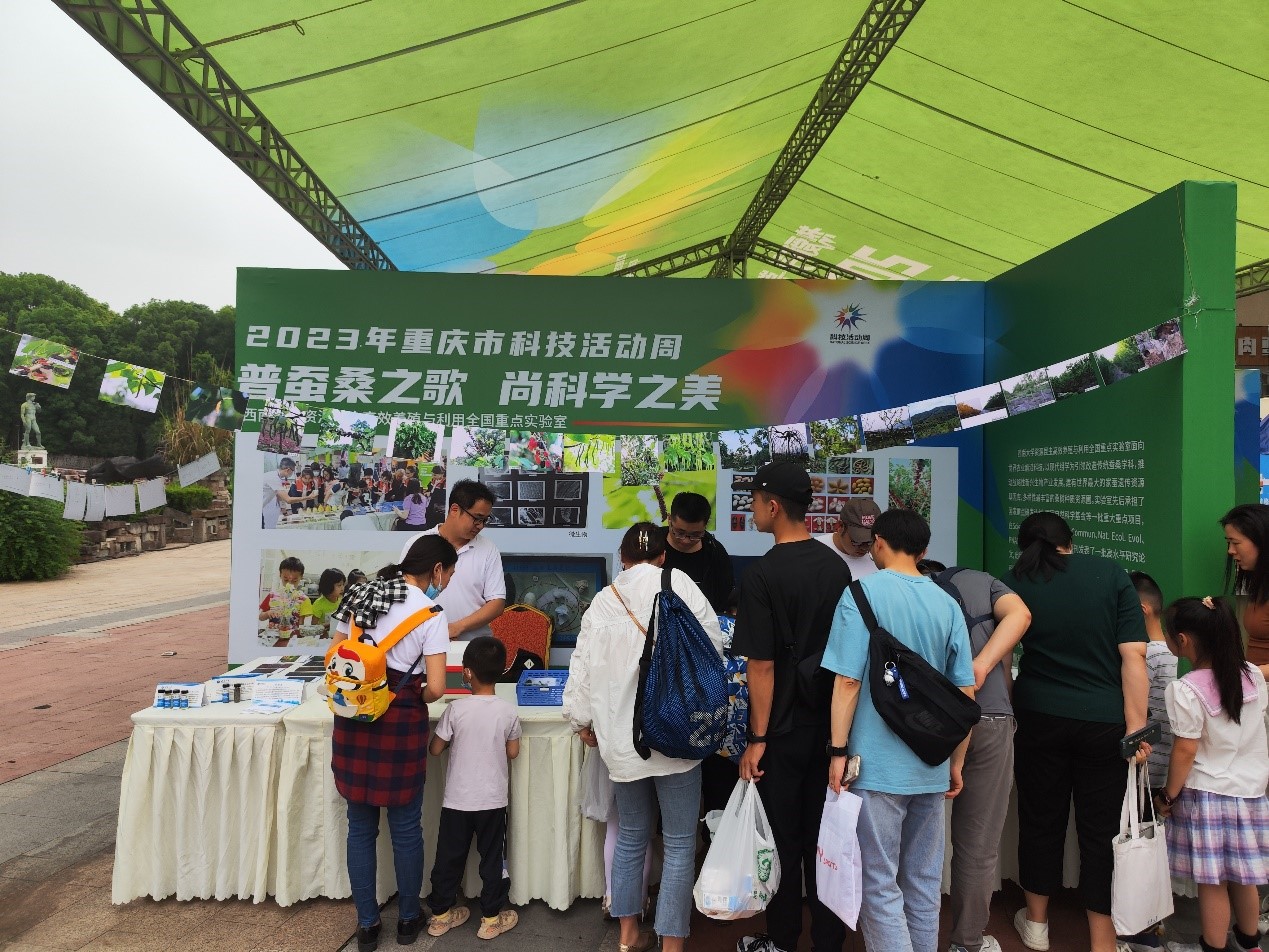 在2023年全国科技活动周系列科普活动中,实验室以“普蚕桑之歌 尚科学之美”为主题,亮相重庆市科技活动周主场展览活动“生态文明与乡村振兴”展区,面向中小幼学生、市民、游客等提供沉浸式体验蚕桑全产业链和五千年蚕丝文化的活力与内涵,展示了现代蚕桑助力乡村振兴、生态建设和大健康的生动场景,反映了多层面的前沿科技成果,受到参与者的一致好评和喜爱。