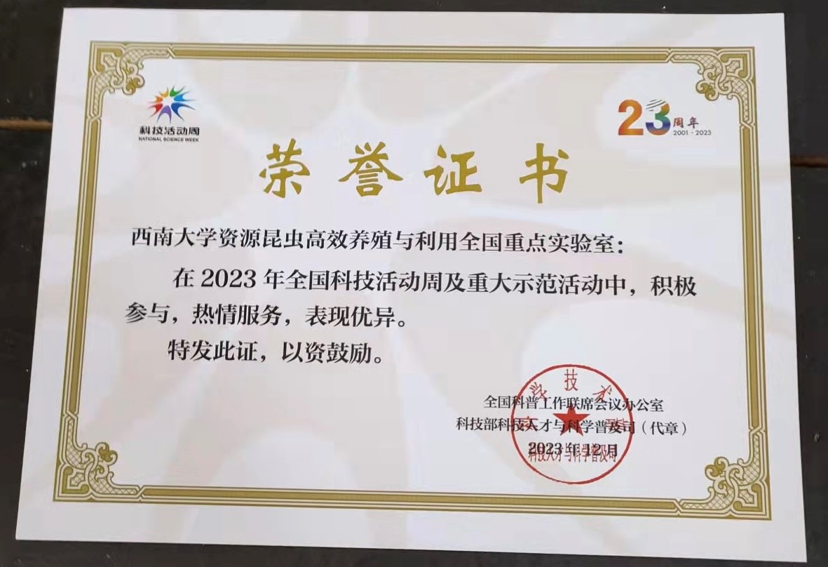 (简称资源昆虫全国重点实验室)收到荣誉证书,实验室凭借在2023年全国科技活动周及重大示范活动中的积极作为和优异表现,受到全国科普工作联席会议办公室表彰。