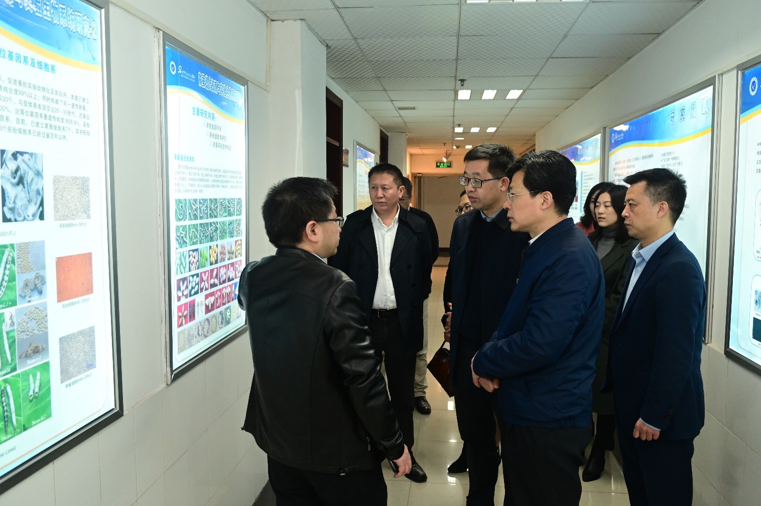 2020年11月3日上午,科技部农村科技司韩文胜副司长在重庆市科技局副局长许志鹏、西南大学副校长赵国华陪同下到家蚕国重室调研指导并看望向仲怀院士。