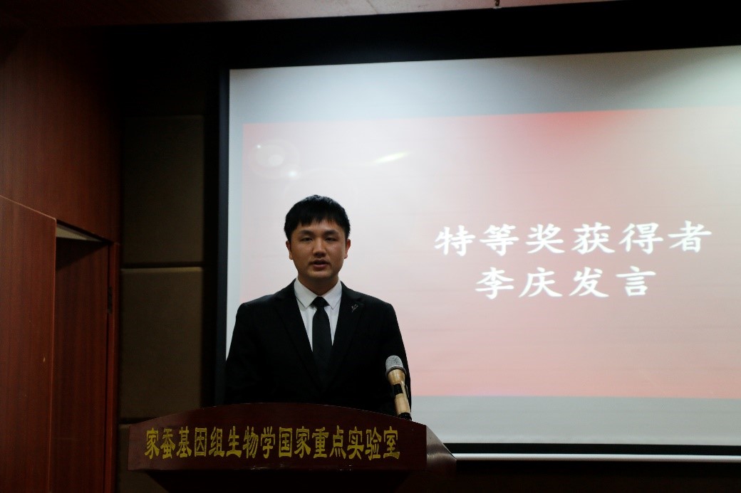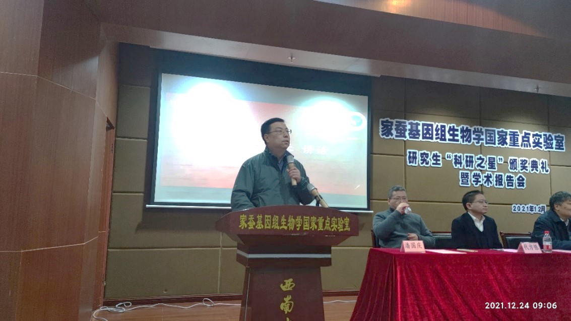 学术委员会副主任周泽扬教授在典礼上讲话,勉励“科研之星”获得者与国重室全体研究生,在这样一个光荣而伟大的时代,要继续奋发创新、砥砺前行,勇攀蚕桑科学研究高峰。