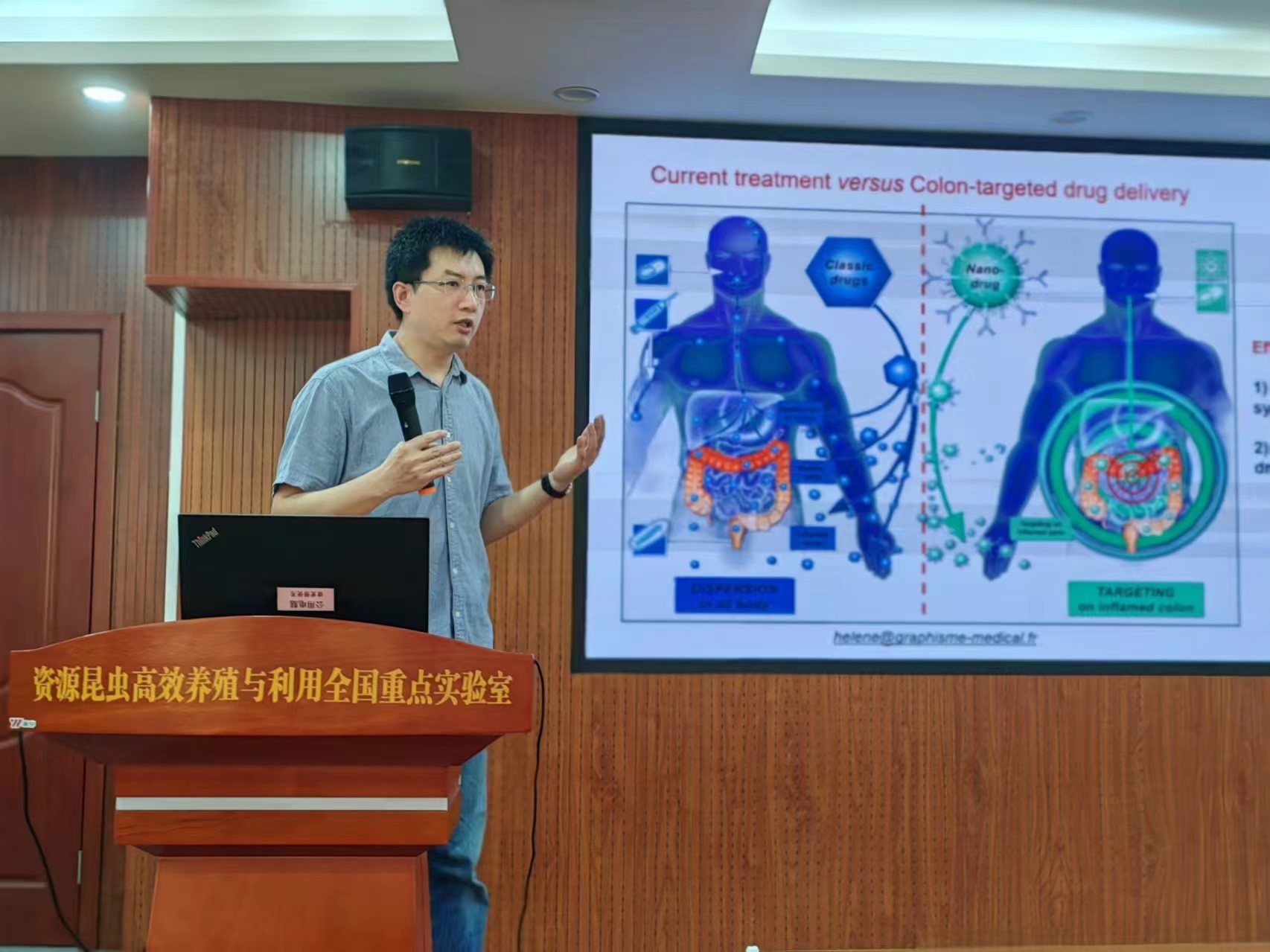 12日上午,实验室在科技楼四楼报告厅举行了杨春华博士专题学术报告会。学术报告会由韩民锦副教授主持,杨春华博士以“溃疡性结肠炎的靶向口服制剂研发”为题,详细介绍了溃疡性结肠炎的发病机制、口服制剂开发及治疗研究现状、新型制剂的临床应用前景等内容。与在场师生围绕结肠炎治疗所面临的技术挑战、现有治疗方法的局限性与解决方案、蚕丝蛋白在结肠炎治疗中的应用优势等问题,进行了深入的交流和讨论。杨博士还分享了他的学术研究经历以及其制备的天然植物来源的纳米药物递送系统开发进展情况。