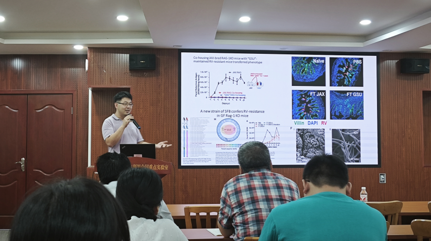 7月29日上午,实验室在科技楼四楼学术报告厅举办了石振达博士专场学术报告会。学术报告会由龙定沛副教授主持,石博士以“The Modulations of Microbiota on Rotavirus and Vaccines”(宿主微生物群对轮状病毒感染及相关疫苗的免疫调控作用)为题,介绍了他在美国学习和工作期间,围绕人类肠道微生物、轮状病毒和宿主之间相互作用关系开展的一系列研究和取得的进展。石博士致力于探究肠道细菌如何通过抑制病毒感染和调节疫苗接种,进而开发出抗病毒疾病的新策略。石博士讲解了其课题组如何通过识别新的治疗蛋白或多肽,实现预防和治愈轮状病毒感染,并提高轮状病毒和流感疫苗在各种小鼠模型中的效力。石博士介绍称,他所在的美国疾病预防控制中心课题组正在寻求理解细菌对轮状病毒感染和疫苗接种的抑制效应的更深层次机制,以推动抗轮状病毒和其他病毒如呼吸道感染病毒的疫苗开发。石博士与在场师生围绕基于宿主微生物群的肠道疾病检测与治疗工作的发展方向、基于纳米药物递送载体的病毒疫苗的开发研究等问题,进行了深入的交流和讨论,会议现场氛围热烈。