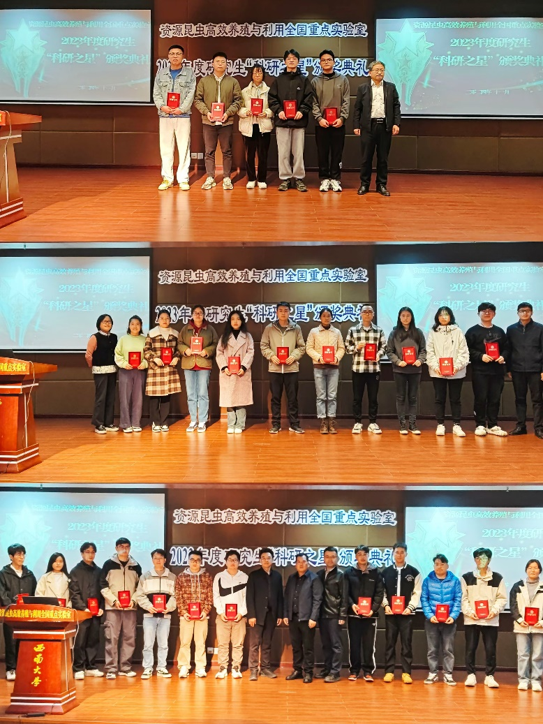 2023年度研究生“科研之星”颁奖典礼于蚕学宫举行。西南大学科学技术处副处长段有德、研究生工作部学生事务办公室主任朱干,学院院长、实验室主任代方银,学院党委副书记朱高峰,实验室副主任何宁佳、程廷才、袁联伟,“科研之星”获奖者、指导教师和研究生代表共150余人参加颁奖典礼。颁奖典礼由程廷才副主任主持。