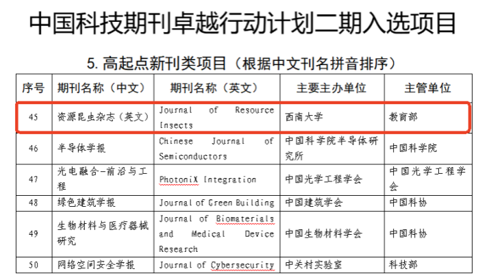 近日,中国科技期刊卓越行动计划二期项目评审结果揭晓,由西南大学、中国农业科学院蜜蜂研究所及中国蚕学会联合主办的Journal of Resource Insects(资源昆虫杂志)成功入选高起点新刊项目。
