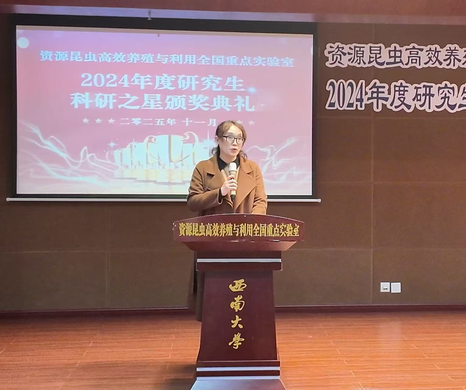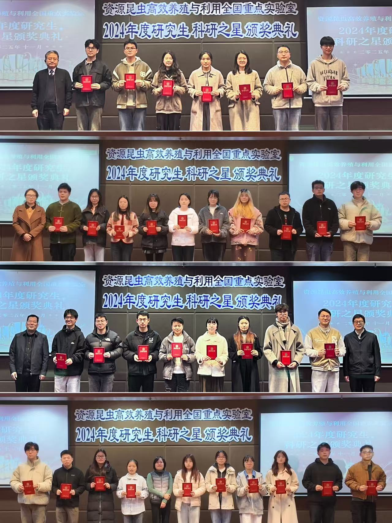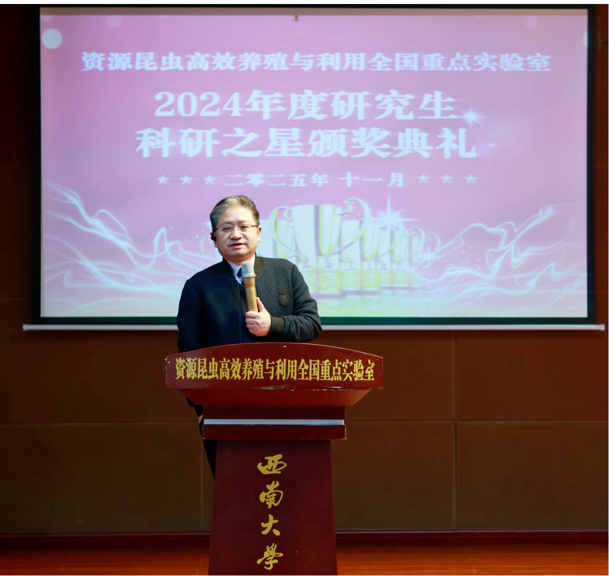 2024年度研究生“科研之星”颁奖典礼在西南大学蚕学宫一楼报告厅举行。实验室主任代方银,西南大学科学技术发展研究院副院长段有德,蚕桑纺织与生物质科学学院党委书记方凤玲、副书记朱高峰,实验室副主任何宁佳、程廷才、李田等出席典礼。“科研之星”获奖研究生、指导教师及实验室师生代表共同参加。颁奖典礼由程廷才副主任主持。